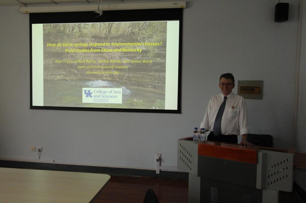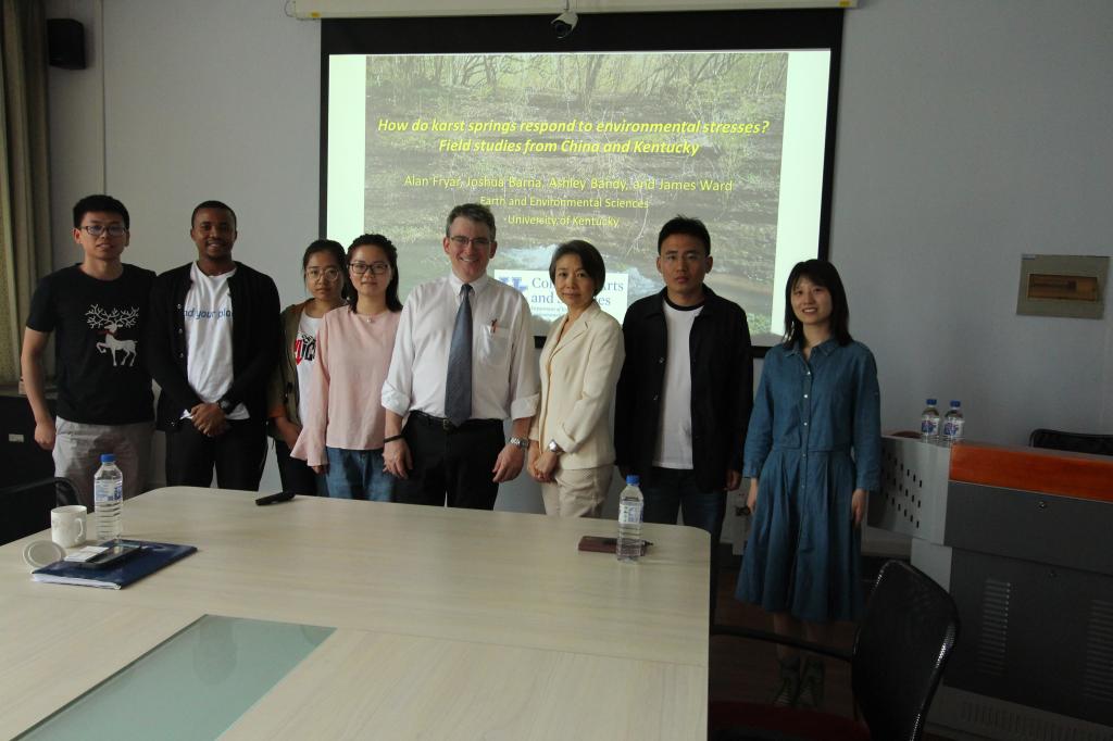 下午,Alan 教授与BEATS师生作题为“How do Karst Spring Response to Environmental Stresses? Field Studies from China and Kentucky (中国与肯塔基典型岩溶泉对环境变化的影响机理)”学术报告。此学术报告由地下水科学与工程系李鸿雁教授主持,在报告会上,Alan 教授阐述了肯塔基州岩溶泉的特点及对环境变化的影响,并与贵州省岩溶泉的特点为例向师生们分享了对比差异。师生们对Alan教授的研究课题表示很感兴趣,并与Alan 教授就报告研究方向进行了深入探讨,收获颇丰。