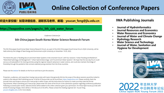 作为本次会议协办单位,国际水协会出版社(IWA Publishing)为会议创建会议文集,收录符合本次论坛主题的相关文稿,详情请见网站(https://iwaponline.com/pages/cc_5th_cjsk_water_forum)。参会嘉宾或有意者可投至IWA publishing旗下的任一期刊,在提交文章时请注明本次论坛名称(The 5th China-Japan-South Korea Water Science Research Forum),并将您的投稿信息告知我们(youcan_feng@jlu.edu.cn)。对于IWA Publishing旗下的开源期刊,我们将提供10%的版面费优惠。
