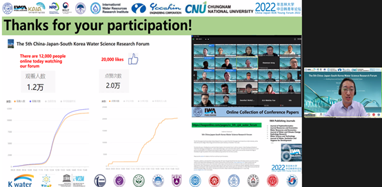 “中日韩水科学研究论坛”依托国家自然科学基金中韩合作交流项目(51711540299),由BEATS和韩国忠南国立大学发起,首创于2017年,本着“学术平等,自由交流,分享经验,促进合作”的原则,旨在共同研究区域水资源对气候变化和人类活动影响的响应规律,为变化环境下水资源合理开发利用和保护提供对策,至今已成功举办五届,国内外与会高校与研究院所参会人数与年剧增,影响人数不断增加。2022年是中日邦交正常化50周年,也是中韩建交30周年,“中日韩水科学研究论坛”为专家学者和青年员工搭建了高水平的国际交流合作平台。冯右骖副教授对本次会议进行总结,对国内外专家学者的高水平学术成果分享表示感谢。韩国忠南国立大学Kwansue Jung教授作闭幕致辞,表示这是一场质量较高、内容丰富、气氛活跃的水科学领域跨国盛会,祝愿“中日韩水科学研究论坛”越办越好,更期待与各位的线下交流!