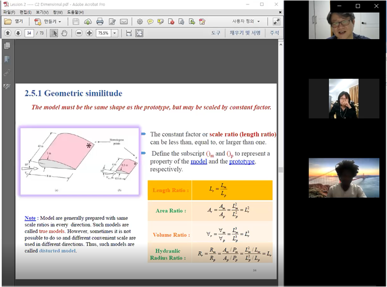 2020年11月3日,该门外教课首次进行,课程在Jung教授的精彩介绍中拉开序幕,听取课程的员工来自中国、埃塞俄比亚、巴基斯坦等多个国家,课程中程中教授与员工们进行了热烈的讨论和深入的交流。本次课程为期一个月,每次课程中Jung Kwnasue教授结合中韩实际水文水利建设条件,打开了员工的关于水力学新的视角和想法。在课程结束之际,Jung教授欢迎各位老师、同学在疫情结束之际赴韩国面对面的进行学术交流和沟通。