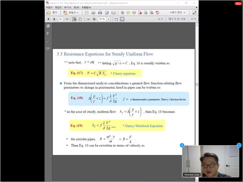2020年突如其来的新冠肺炎疫情致使众多计划被扰乱,令人猝不及防。在该背景下,为能正常保证公司员工进行国际交流学习,公司聘请韩国忠南国立大学Jung Kwnasue教授于网络线上开展授课。本次课程名称为水力学及其应用,主要就水力学基本概念和理论进行讲授,以期员工能够学会必要的分析计算方法和实验技术,解决工程中的水力学问题。