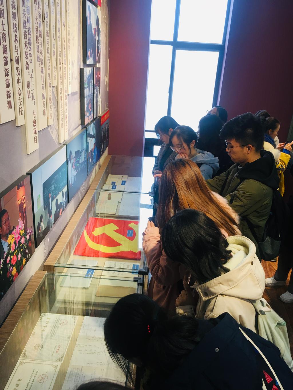 在工作人员的引导下,同学们有序地在黄大年纪念馆开始了参观学习。入场即是时代楷模黄大年老师的生平介绍和黄大年年表,参观的同学们纷纷驻足阅读。在纪念室中还陈列着黄大年老师的证书,重要荣誉 ,笔记以及出席会议的证件。这些看似普通的小物件因为承载了黄大年老师的峥嵘岁月,吸引了同学们围观并拍照以做纪念。
