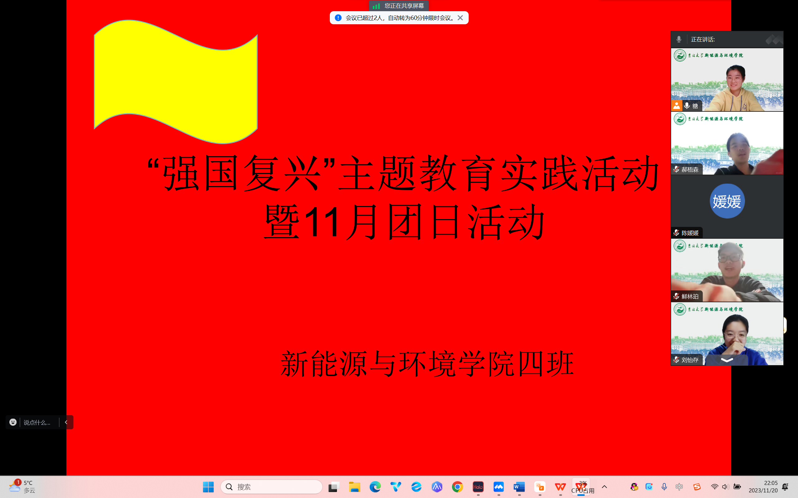 党的二十大以来,以习近平同志为核心的党中央高度重视、热情关怀青年、充分信任青年,鲜明的提出了党管青年原则,为深入学习党的二十大关于全面建成社会主义现代化强国,以中国式现代化全面推进中华民族伟大复兴战略和习近平总书记的相关重要论述。BEATS252304班团支部于十一月二十日晚六点在团支书唐烨的带领下开展“强国复兴”主题团日活动。此次活动共有包括团支部内25名共青团员在内的36位青年参加。