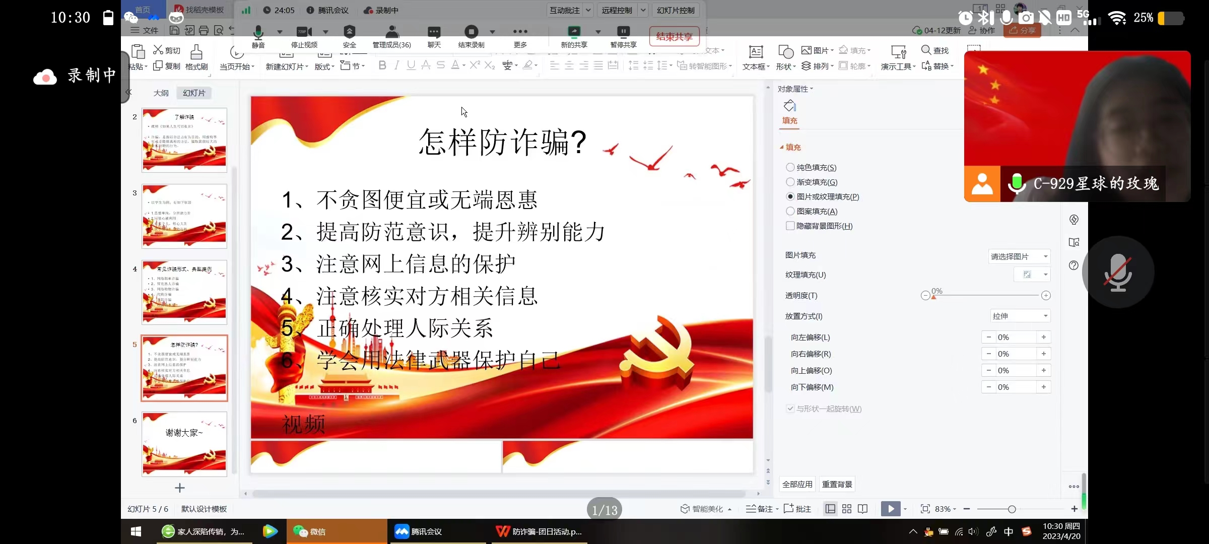 当今社会,电信诈骗案的手段层出不穷。为进一步扩大反诈宣传覆盖面,提高各同学的反诈骗意识、维护大家的财产安全,BEATS252202班团支部于4月20日上午十点在团支书郭诗语的带领下,于线上开展“防范诈骗擦亮眼 拒绝诱惑心不贪”反电信网络诈骗宣传教育主题团日活动。本次团日活动共有包括支部内29名共青团员在内的34位青年参加。