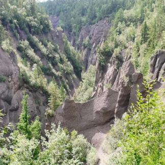 7月12日,在李杰老师等各位老师的带领下,同学们探索了浮石林、冰水泉和彩虹秘境,并进行了文化服务中旅游康养价值评估设计的社会调查。李杰老师讲解了浮石林中火山碎屑物的层次变化、风化壳的形成、彩虹秘境中的物质组成特点及后期的外力改造等,极大地丰富了同学们的地学知识。浮石形态各异,火山碎屑物堆积层次分明,独特的地貌展示着大自然的鬼斧神工和特有的岁月痕迹,同学们无不被其所吸引折服。冰水泉天然的泉水甘甜冰凉,一扫同学们的疲惫闷热。实习途中同学们把握机会,克服社恐和害怕被拒绝的心理,寻找路人进行社会实践调查。多种颜色的火山碎屑物堆积形成了彩虹秘境,一条条清晰可见的水平层理昭示着时空长河流动的足迹,引领我们去探寻亿万年时光中地质变迁的秘密。