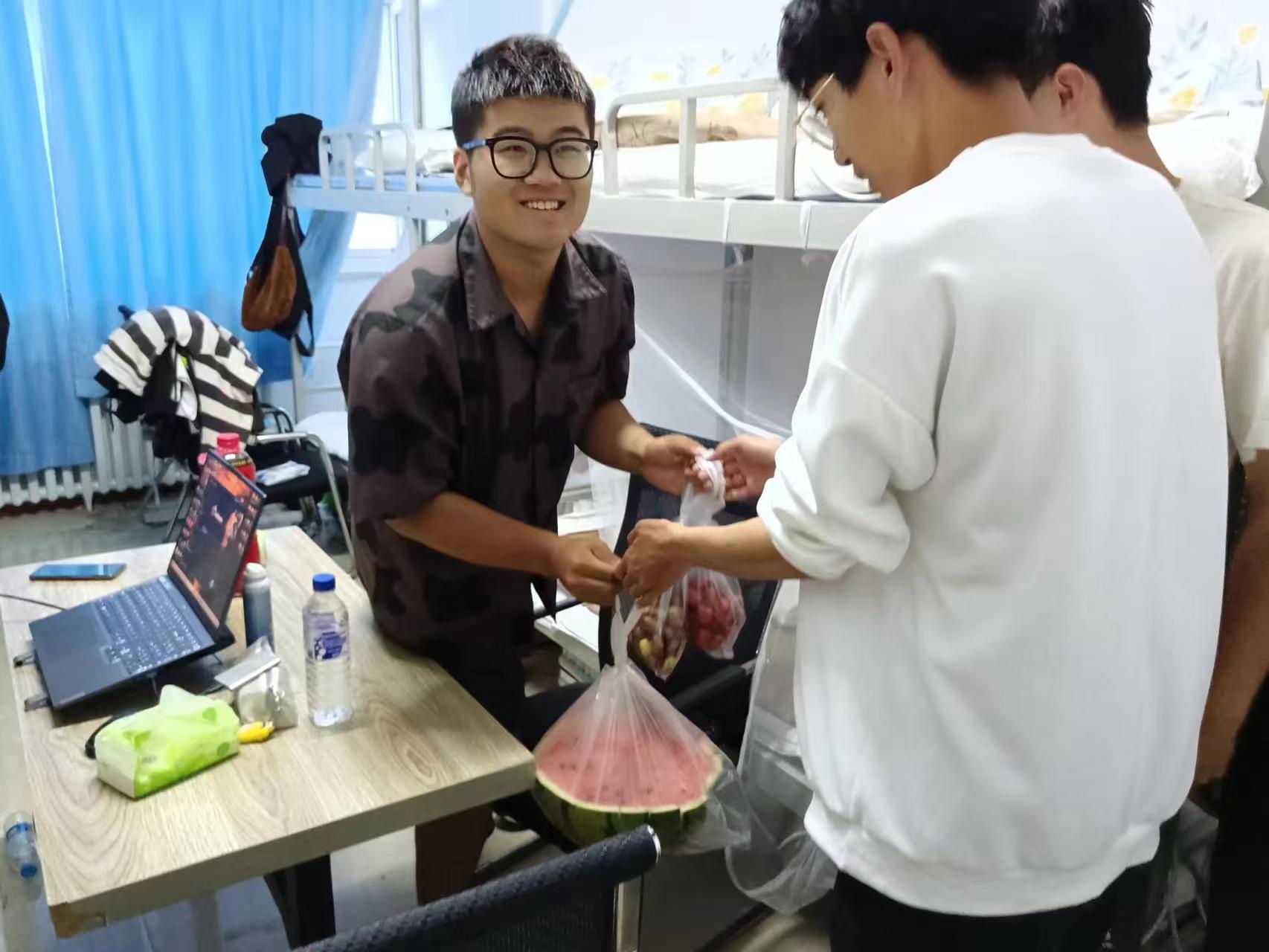 晚上,公司为师生们购买的西瓜、甜枣、小番茄等水果被送到教职工公寓和员工寝室,分发慰问品的过程中,欢声笑语响满走廊。公司的关心关爱,让大家更加珍惜本次实习机会,让在基地的师生们拉近距离感受到家的温暖。