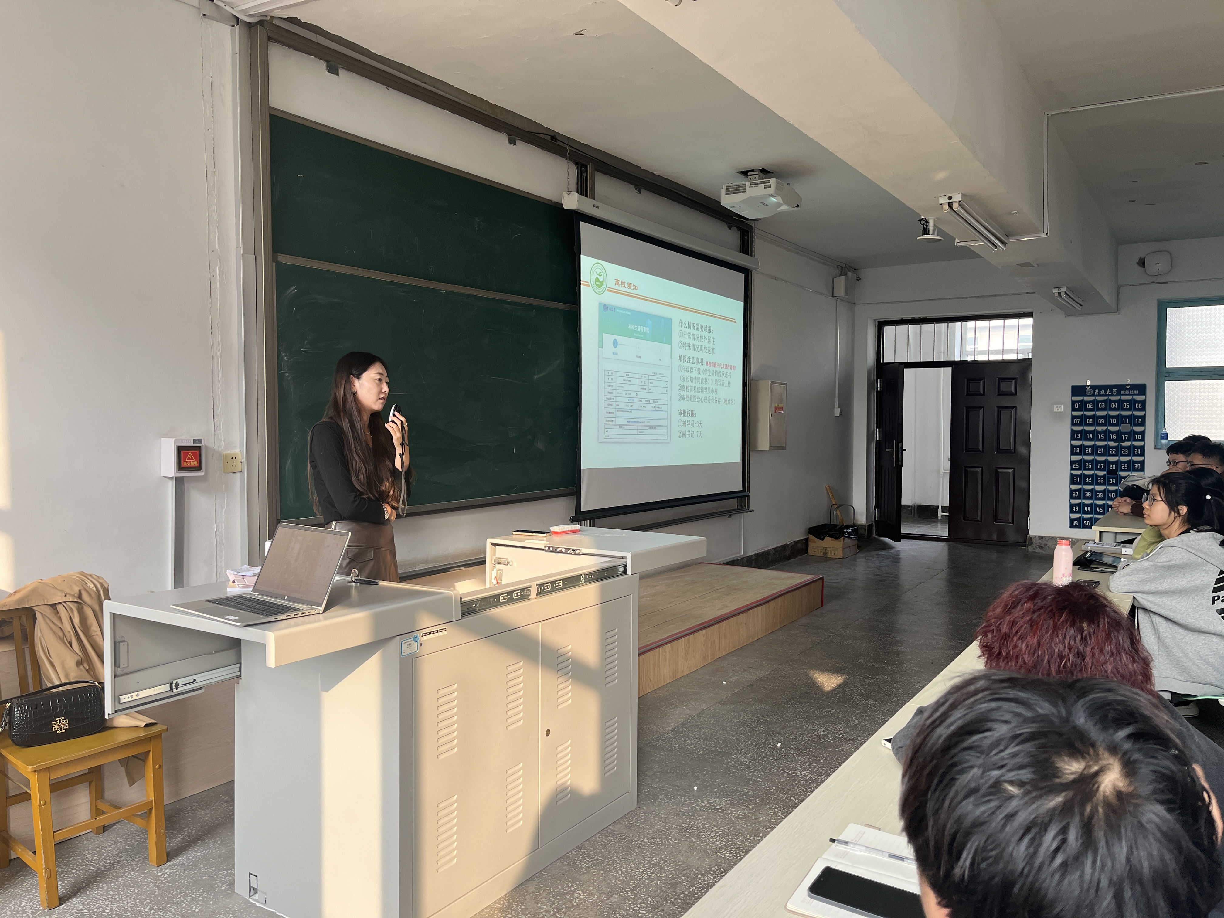 会议开始,李老师首先对本学期日常离校和课程请假相关事宜进行解答,明确日常离校请销假流程,提醒需要请假的同学在“网上办事大厅-本科生请假审批”处进行申报,上传《家长知情同意书》,辅导员老师审批后请假申请完成。其中,假条事假需家长致电沟通;除生病住院特殊情况外,员工有课时期事假不予批准。李老师强调离校请假不等同于课程请假,如无法按时上课员工本人需提前和任课教师请假,征得任课教师同意,否则为旷课。
