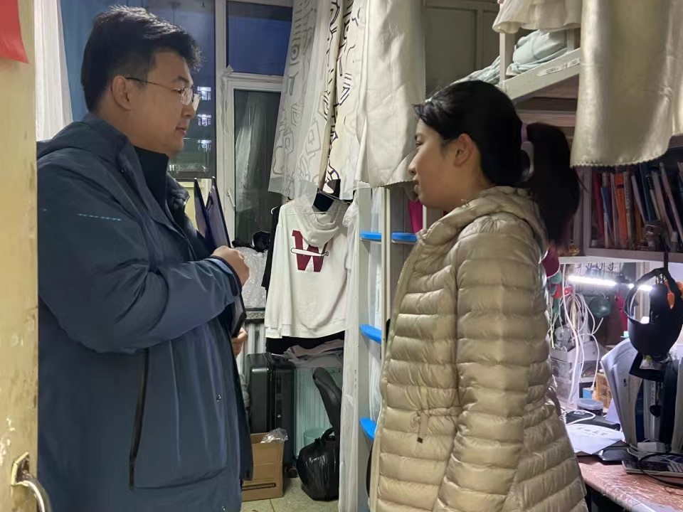 4月12日,2020级辅导员霍美汐老师对BEATS朝阳校区五公寓、七公寓42间寝室进行检查,提醒同学们注意寝室卫生,了解同学们毕业去向等情况,强调寝室安全。
