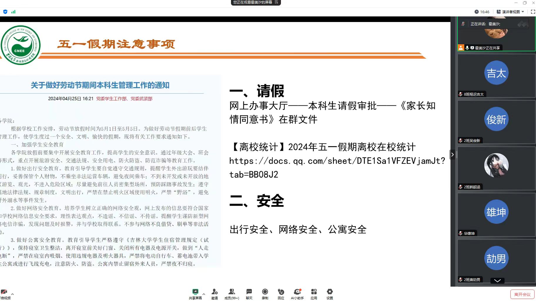 为深化员工安全意识,迎接即将到来的“五一”假期,确保员工在校及出行安全,2024年4月28日-30日,BEATS员工工作办公室全体辅导员先后组织各年级同学开展了“安全出行,礼赞劳动”主题年级大会。