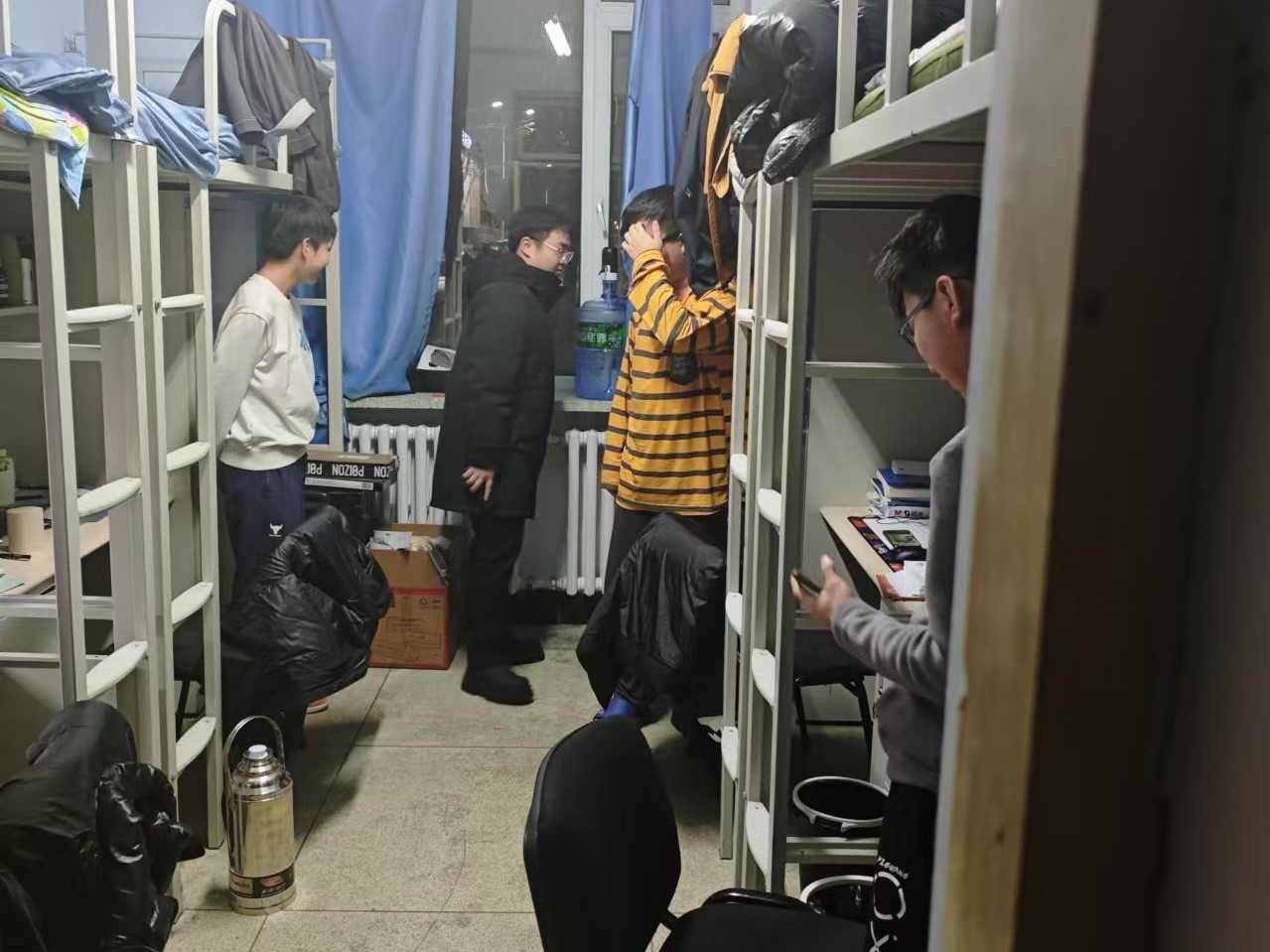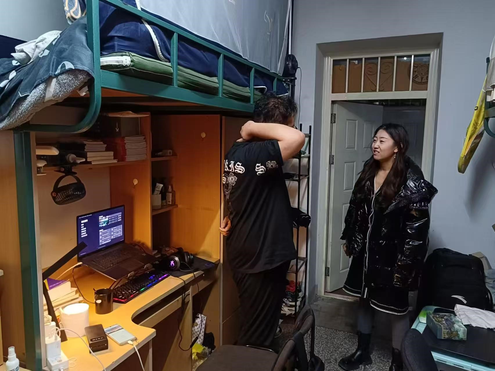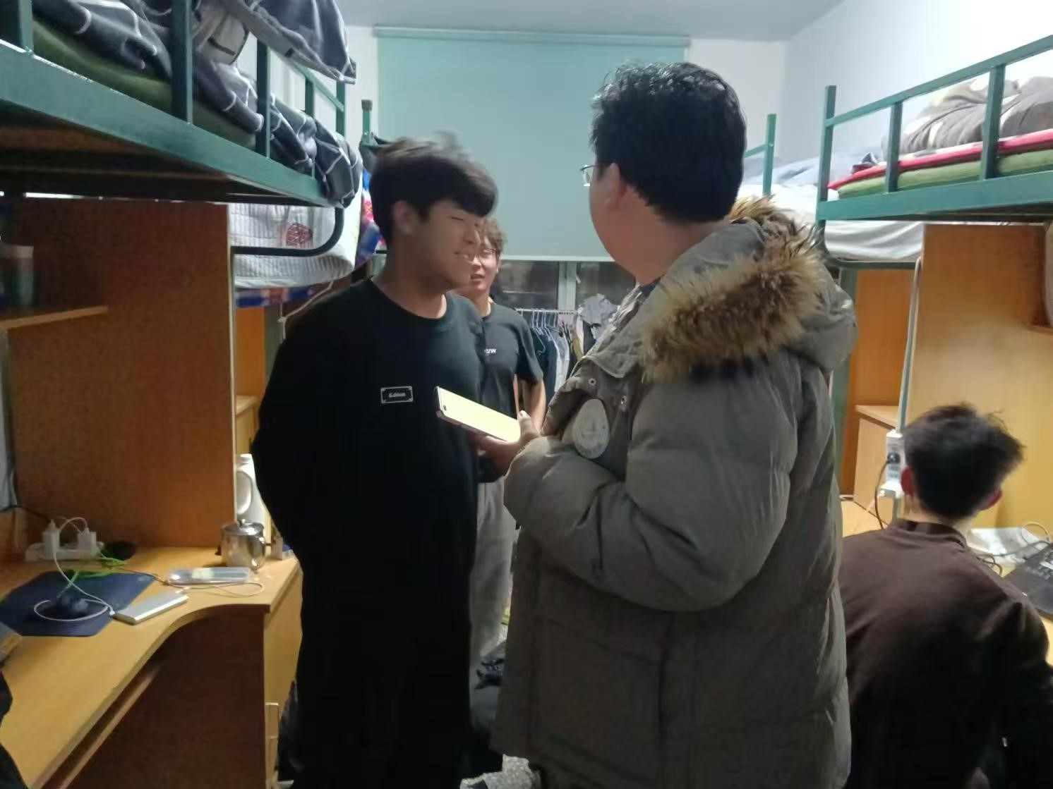 12月6日,2024级新生辅导员助理姜兆轩进入南苑一公寓寝室,检查寝室卫生和同学们的在校情况,并提醒同学们已经进入期末月,要尽早开始复习。
