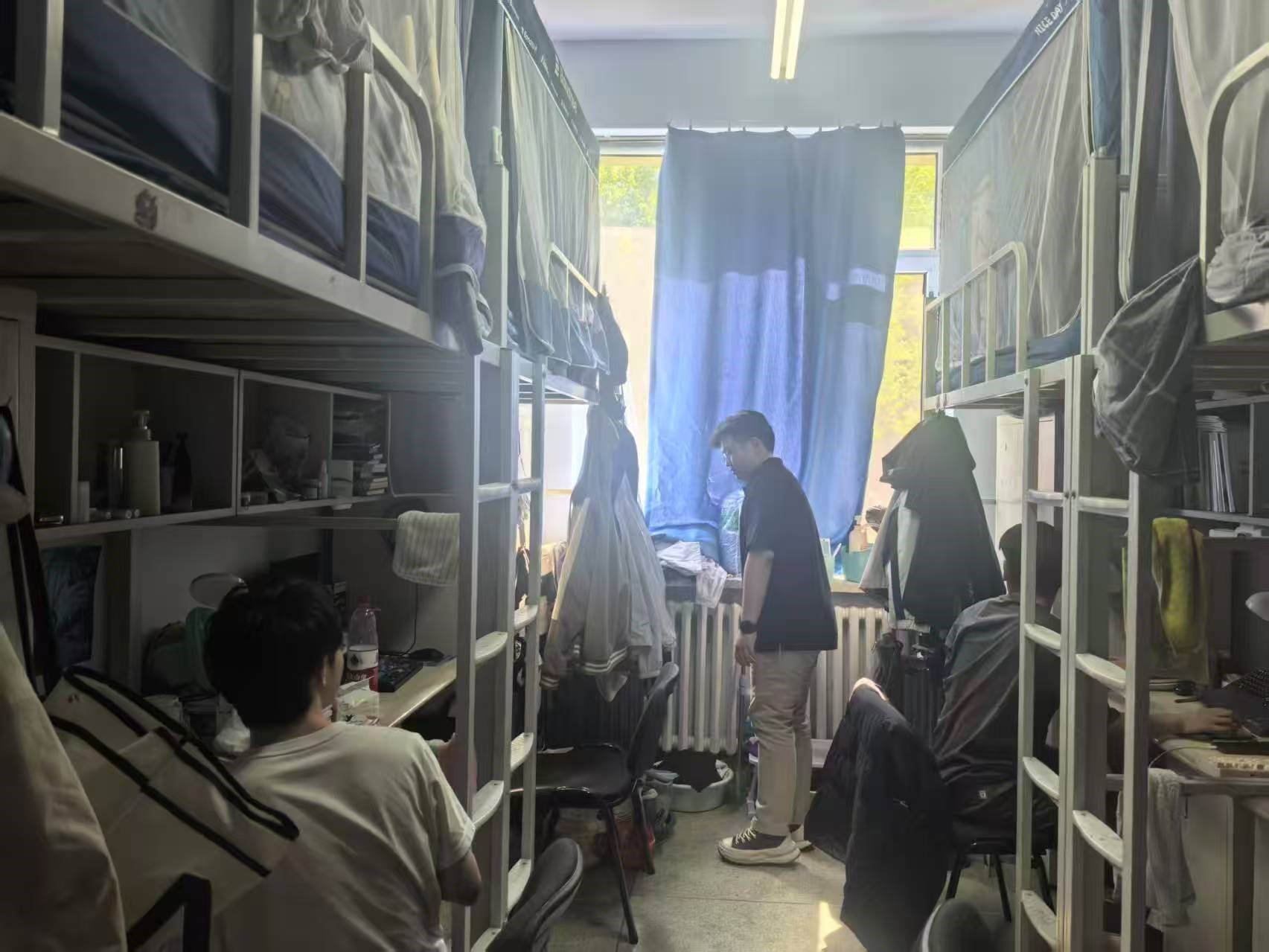 6月12日,2022级辅导员母茂松老师进入朝阳七公寓检查消防安全和寝室卫生,提醒员工及时整理寝室卫生,做好期末学习考试准备。