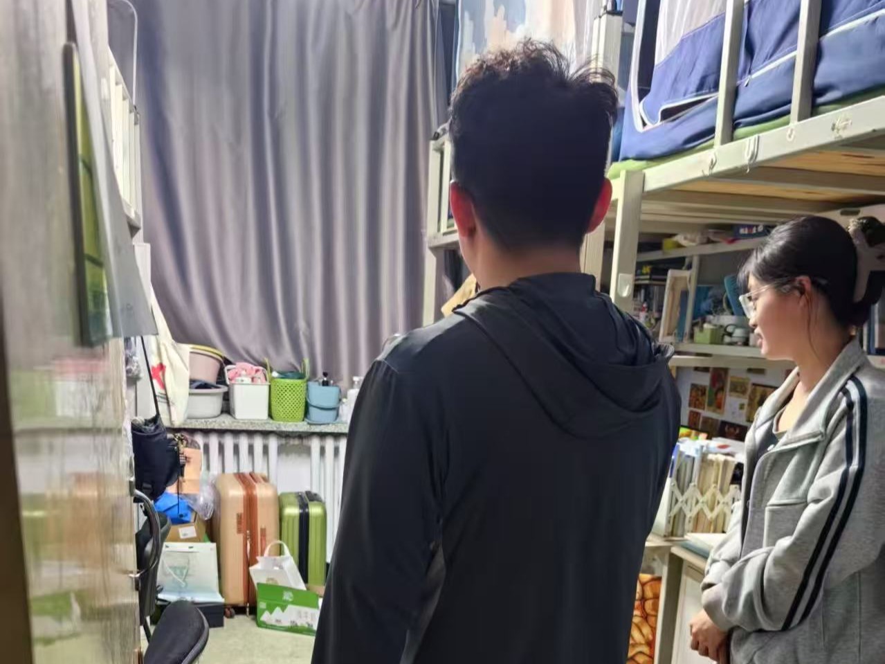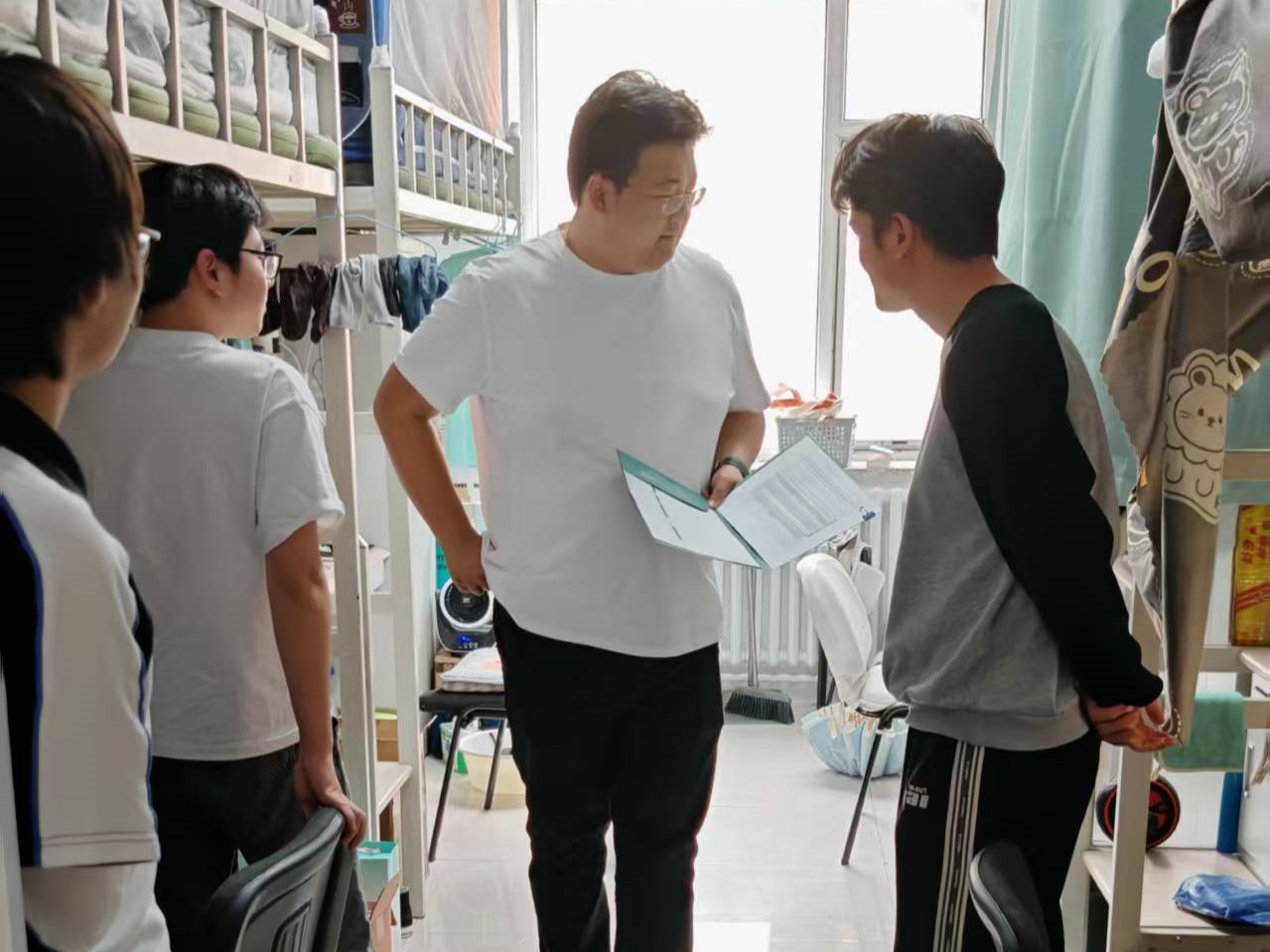 6月12日,2023级辅导员姜岳彤老师进入南苑二公寓寝室检查消防安全和寝室卫生,提醒同学们及时收拾物品并做好期末准备,及时开窗通风保持良好宿舍环境。