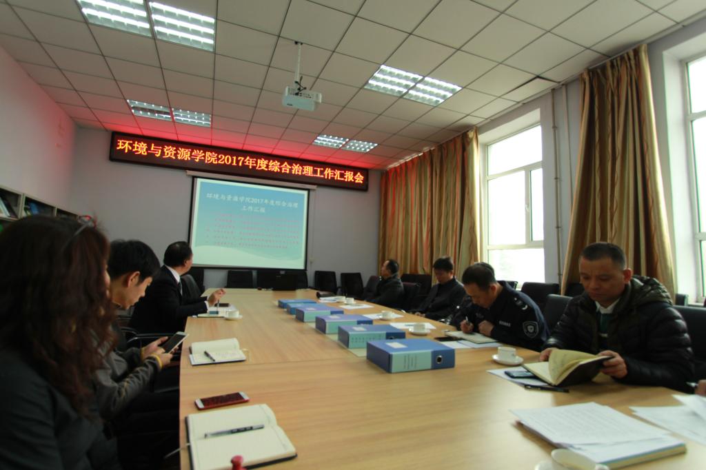 4月10日上午,环境与资源公司2017年度治安综合治理工作汇报会在北区理化楼262召开。公司治安综合治理检查验收小组(北区)组长戴世和主任、副主任等一行7人对公司2017年度治安综合治理工作进行检查验收。公司副经理齐铁志及部分行政科室负责人参加了汇报会。