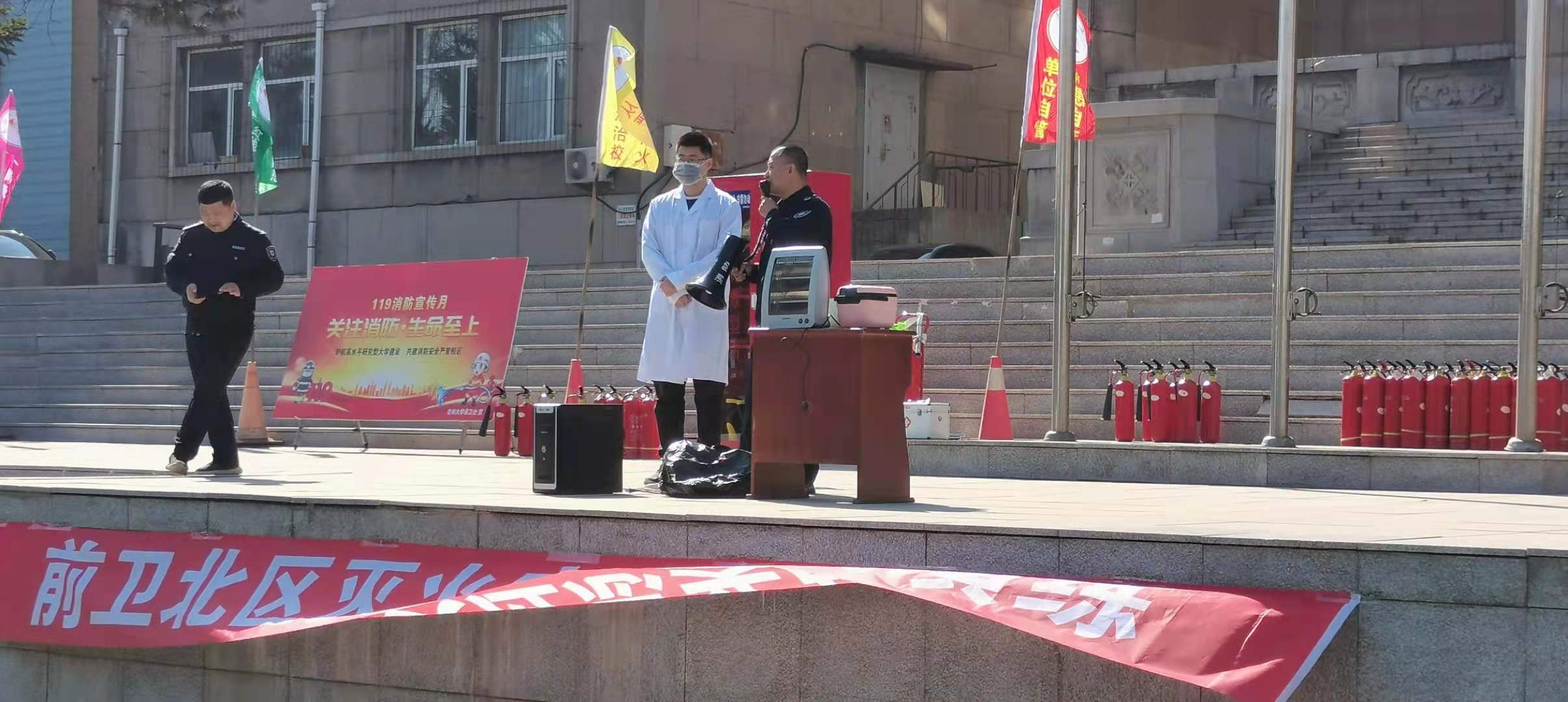 为进一步提高师生的消防安全意识,学习掌握初期火灾的灭火常识,营造消防安全严格的校区氛围,BEATS联合保卫处等单位,于2021年4月20日上午分别在北区理化楼、北区理化楼后侧篮球场,参加了前卫北区2021“迎百年党庆”安全攻坚行动,组织重点工种人员岗位培训及应急灭火实战演练。BEATS由徐军副经理带队,保卫处刘英涛等同志予以现场指导,公司各实验室老师及负责人、新入职的教师、员工代表,参加了这次实战演习。