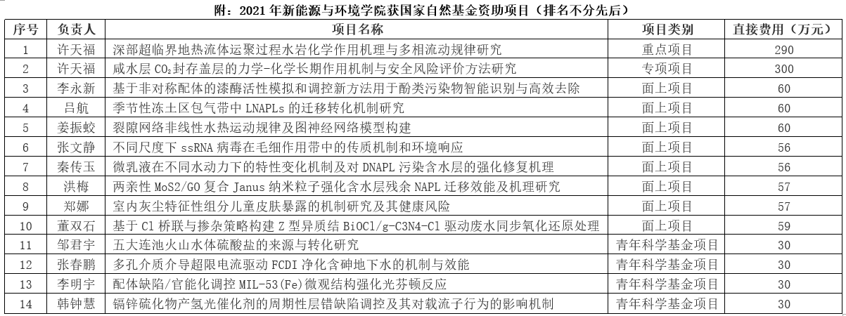 许天福教授主持申报的“咸水层CO2封存盖层的力学-化学长期作用机制与安全风险评价方法研究”获批直接经费300万元。是国家自然科学基金委员会地球科学部和管理科学部联合启动“面向国家碳中和的重大基础科学问题与对策”的专项项目;是服务于国家碳中和战略、拟针对国家碳中和的重大基础科学问题与对策开展的专项资助工作;也是公司获得基金委资助的第一个专项项目。