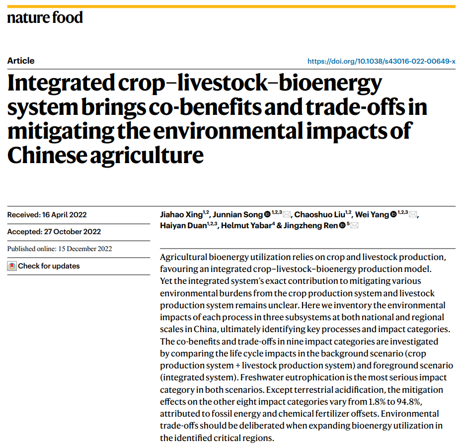 日前,由公司宋俊年教授研究团队领衔,与日本筑波大学、香港理工大学研究团队合作,在生物质能利用与农业环境影响研究领域取得重要进展,研究成果以“Integrated crop-livestock-bioenergy system brings co-benefits and trade-offs in mitigating the environmental impacts of Chinese agriculture”为题发表在农业与食物领域顶级期刊《Nature Food》。BEATS地下水资源与环境教育部重点实验室为该成果的第一完成单位,这是公司首次在《Nature》子刊发表研究论文。