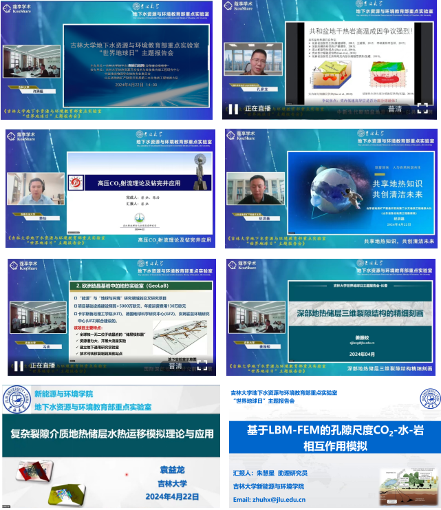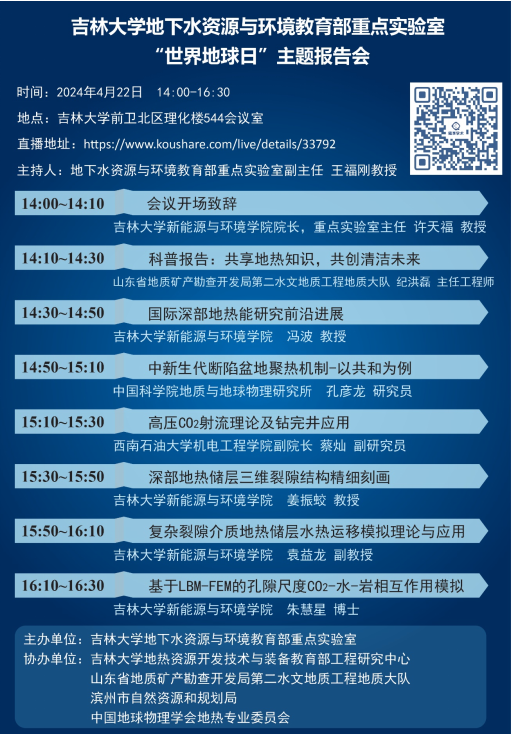 2024年4月22日是第55个“世界地球日”,主题为“全球战塑”(Planet vs. Plastics)。今年的世界地球日主题报告会活动由“地下水资源与环境教育部重点实验室主办,BEATS地热资源开发技术与装备教育部工程研究中心、山东省地质矿产勘查开发局第二水文地质工程地质大队、滨州市自然资源和规划局、中国地球物理学会地热专业委员会联合协办”,蔻享学术网络平台提供直博服务。报告主题围绕应对全球气候变化的国际关注热点问题,分别从绿色能源-地热能开发,以及二氧化碳减排地质封存两方面进行科普宣讲和学术研讨。会议由地下水资源与环境教育部重点实验室副主任王福刚教授主持,重点实验室成员及研究生50余人线下参加此次学术交流活动,6000余人通过“蔻享学术”平台直播观看了此次报告会。