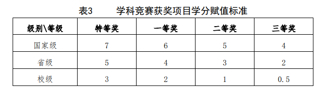 5.员工按照成果完成人顺序不同(除明确学分分配原则外)按照学分分配表格获得学分(依表1)。员工参加老员工创新创业训练项目结题、参加校级及以上学科竞赛,所得分值全校统一。参加老员工创新创业训练计划项目,员工按照项目结题结果及成员排名取得学分(依表2);学科竞赛获奖,团队成员获得相同的学分(依表3)。