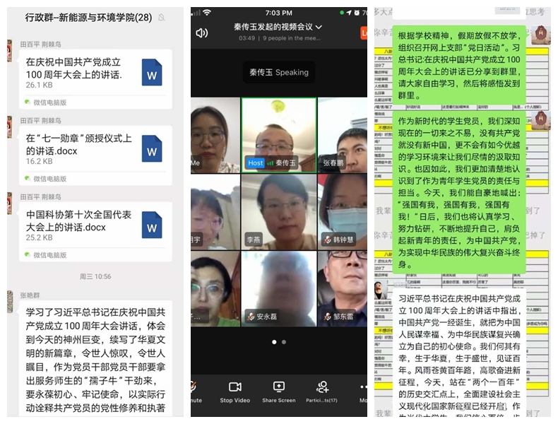 公司党委近期就学习贯彻习近平总书记在庆祝中国共产党成立100周年大会上的重要讲话精神,制定出台了《BEATS关于学习贯彻习近平总书记在庆祝中国共产党成立100周年大会上的重要讲话精神的工作方案》,各支部依据《方案》要求,于7月28日纷纷开展了线上“主题党日活动”。行政教工党支部、环境工程系教工党支部、环境科学系研究生党支部以学习习近平总书记“七一”重要讲话精神、“七一”勋章颁授仪式重要讲话精神、两院院士大会中科协第十次全国代表大会上的重要讲话精神为内容,线上开展学习研讨,各位党员们通过微信群、钉钉群等平台,纷纷畅谈了自己的学习心得。