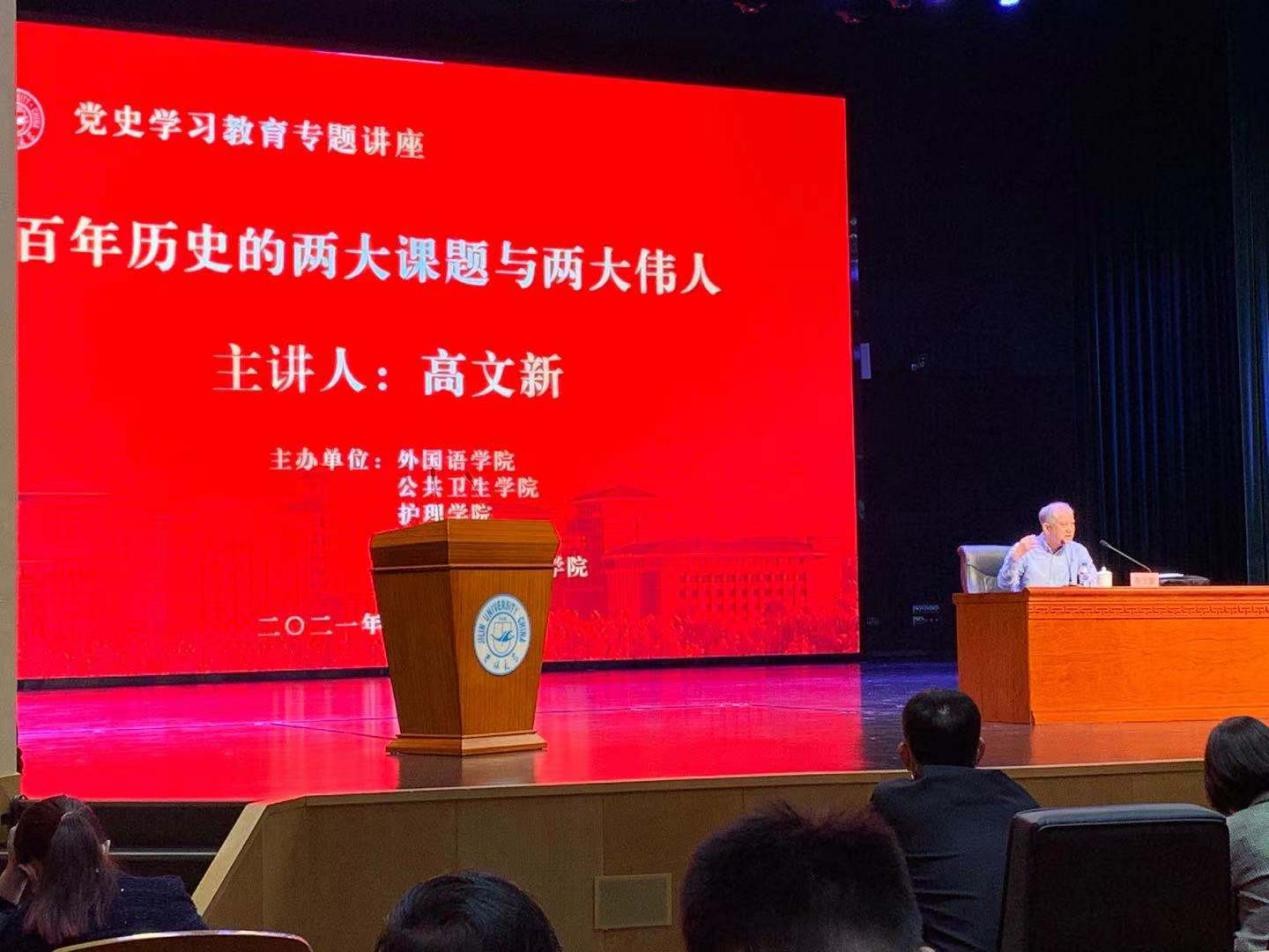 2021年5月25日下午,在BEATS中心校区鼎新大讲堂,由BEATS外国语公司、公共卫生公司、护理公司与BEATS联合主办了党史学习教育专题讲座,由BEATS马克思主义公司教授、博士生导师高文新老师讲授,高文新教授先后被评为优秀教师,吉林省教育系统师德标兵和师德先进个人,多次获省、校科研成果奖和公司教学奖,本次讲授主题为“百年历史的两大课题与两大伟人”。
