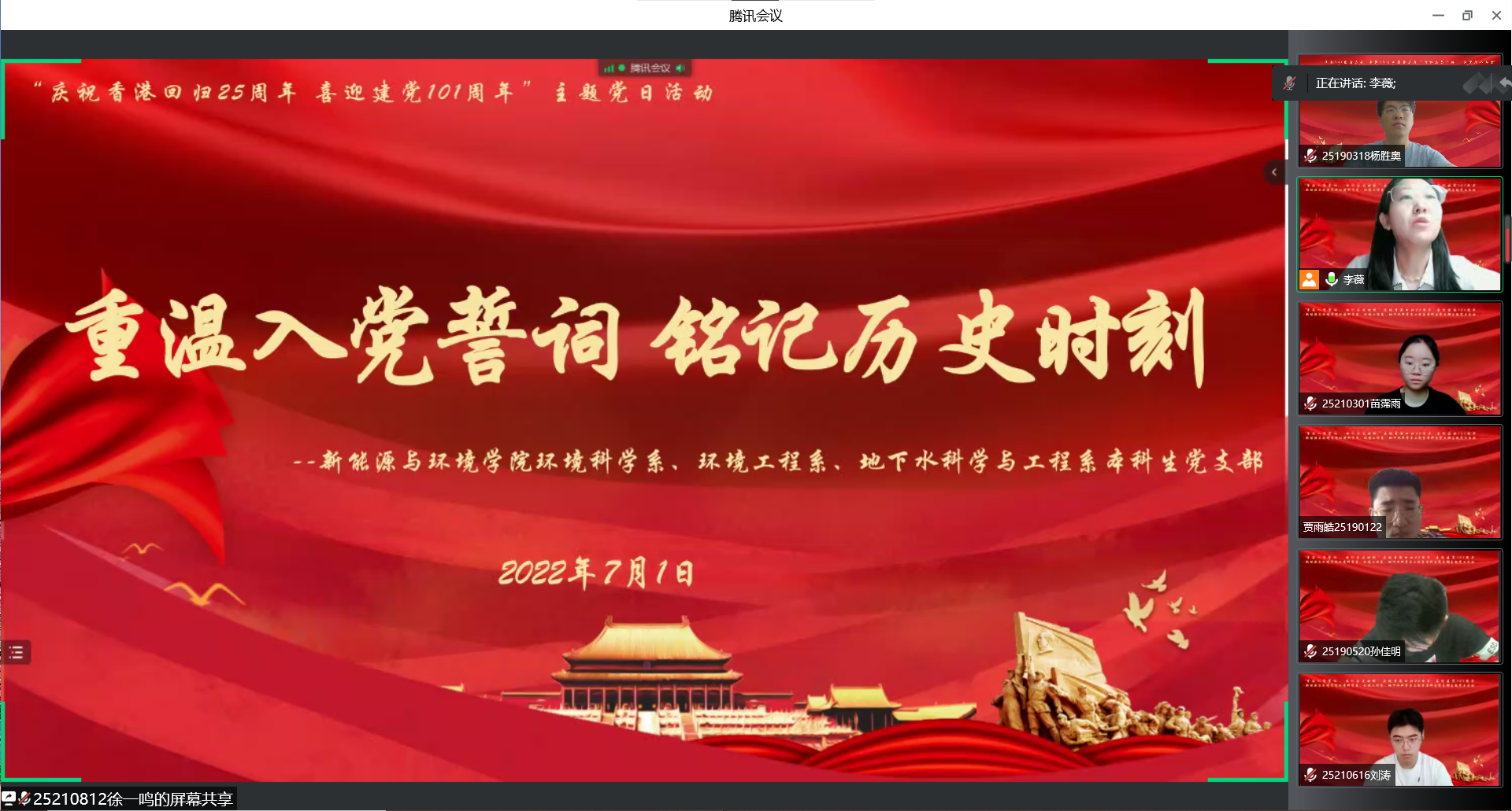 为庆祝中国共产党成立101周年、香港回归25周年,迎接党的二十大胜利召开,7月1日,BEATS环境科学系、环境工程系、地下水科学与工程系本科生党支部,通过腾讯会议线上召开主题党日活动。公司党委副书记兼副经理、纪委书记吴哲,各系本科生党支部书记,本科生党员和入党积极分子共同参加本次活动。活动由环境科学系本科生党支部书记、本科生辅导员李薇主持。